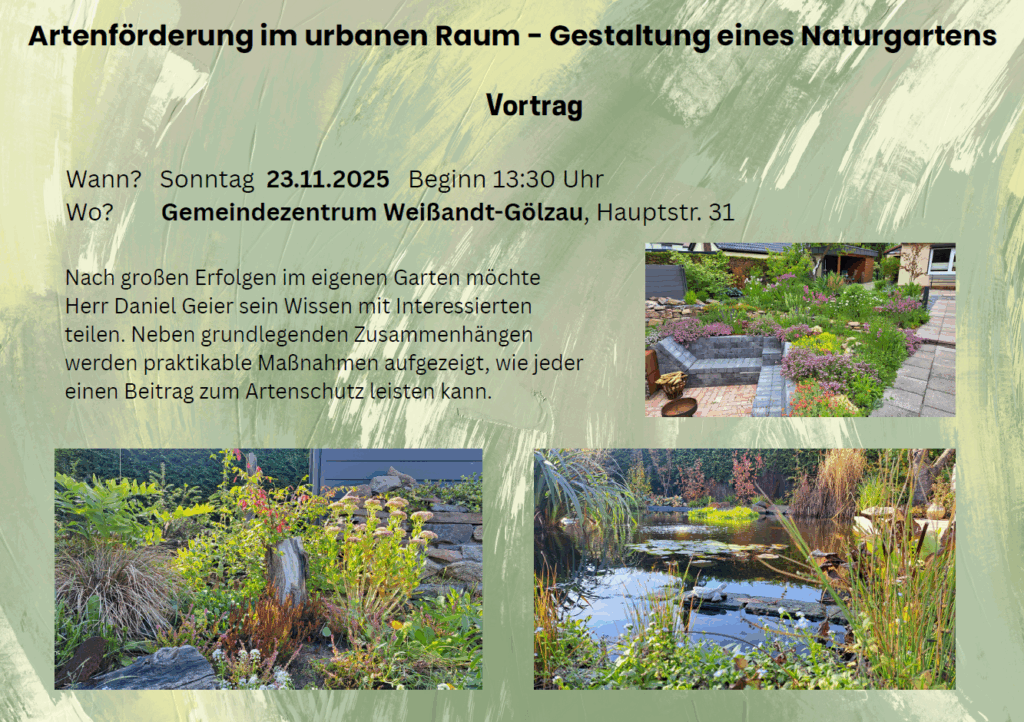 Nach großen Erfolg im eigenen Garten möchte Herr Daniel Geier sein Wissen mit Interessierten teilen. Neben grundlegenden Zusammenhängen werden praktikable Maßnahmen aufgezeigt, wie jeder einen Beitrag zum Artenschutz leisten kann.